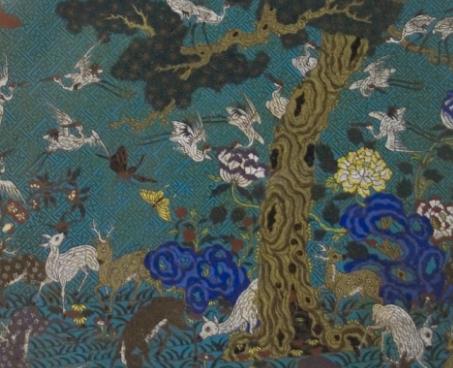 鹤鹿同春” 图案起源于明代,最初以六鹤表现,明代晚期衍生出鹤、鹿双兽图案。“鹤” 为仙禽,象征长寿高洁;“鹿” 谐音 “禄”,寓意福禄双全。二者常与松树、梅花等搭配,构成 “六合同春” 之意,“六合” 指天地四方,寓意天下皆春、万物欣欣向荣,表达了人们对国泰民安、繁荣盛世的期盼和对平静安逸生活的向往。清代因神仙思想的影响,该图案又增加了长寿、富贵的寓意晚清民国时期,景泰蓝技艺虽因社会动荡有所起伏,但仍在民间得以传承和发展,一些民间作坊如老天利、德兴成等制作出不少精美的景泰蓝器物。