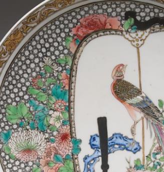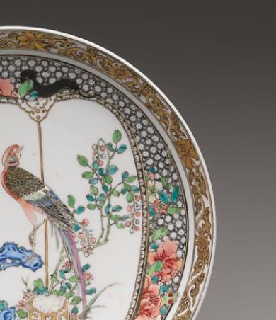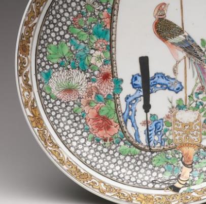 涂有釉彩粉彩玫瑰珐琅和金(可能还有银)的瓷器 尺寸:直径 轮辋的宽度:7 7/8英寸(20厘米) 这件的设计层次表现出密集和精确的装饰,代表了中国乾隆时期的艺术。一个短柄的风扇,一只鸟栖息在开花的树枝上,充满了这 个小盘子的中央。风扇被涂在粉红色和绿色的大花朵上,依次放在黑色(可能是银色)和白色的较小花朵的郁郁葱葱的背景下。风 扇边缘和平板边缘的附加设计也是18世纪的特色。