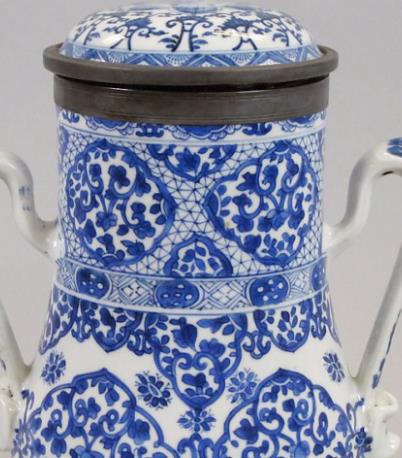 高(带盖)11 3/4英寸(29.8厘米)青花发色鲜艳,色泽艳丽,浓郁之处偏暗,能通过青花料的不同浓淡层次,表现出 “墨分五色” 的效果常以青花绘制花卉型上具有方唇、平沿、敛口、弧肩、鼓腹、平底或圈足等特点