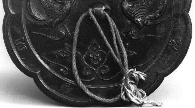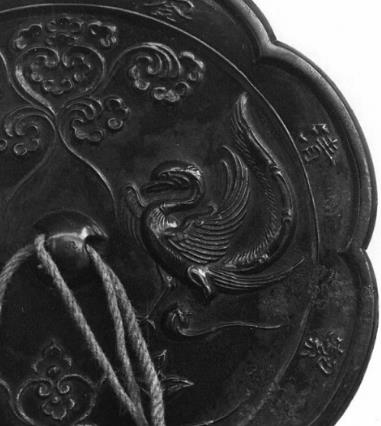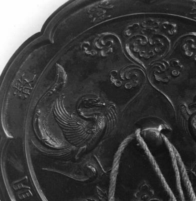 直径 6 1/4英寸(15.9厘米)镜背的主题纹饰为两只鸾鸟,通常位于镜钮左右两侧,呈对称分布。鸾鸟曲颈相对、振翅翘尾,作翩翩起舞状。有的鸾鸟口衔葡萄枝蔓果实,有的口衔绶带。绶带因与 “寿” 谐音,寓意长寿;葡萄则有多子多福之意。鸾鸟一般采用浮雕技法,雄鸟体态雄壮,呈俯视状,雌鸟体态修长秀美,呈上仰状,羽翅遒劲,尾翼细长。镜钮上下常配有类似荷花的花卉图案,边缘则多点缀如意云纹或蝶草等纹饰,整体布局和谐,线条灵动自然。