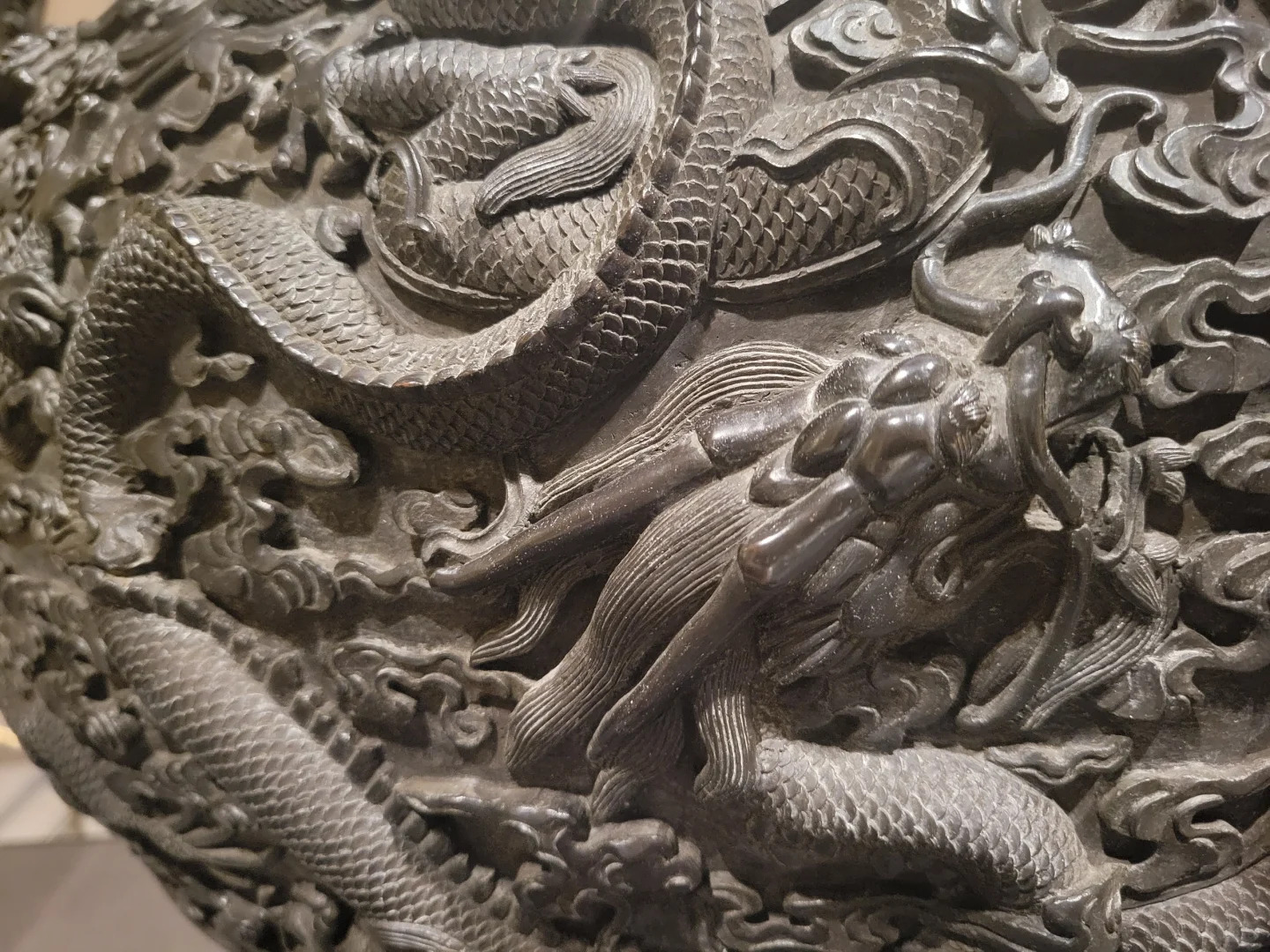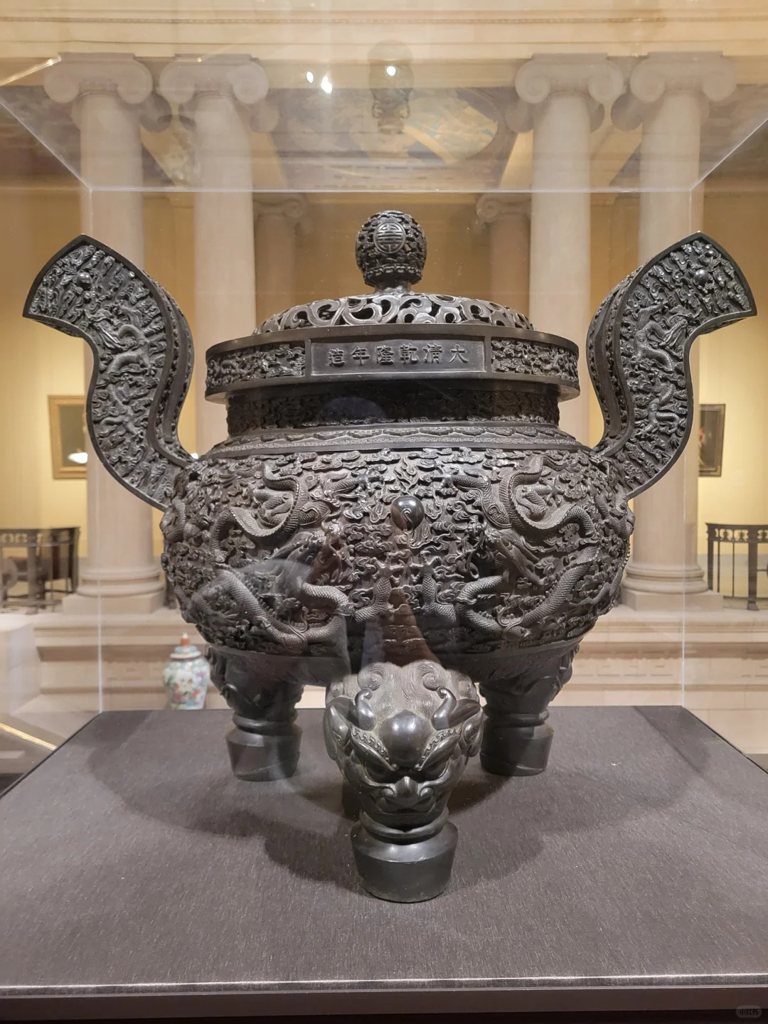 装饰细节:香炉主体以双龙赶珠纹为主要装饰,两条龙雕刻得栩栩如生,龙身矫健,张牙舞爪,围绕着中间的宝珠,充满动感和威严。龙纹周围还饰有云纹、火焰纹等辅助纹饰,丰富了画面层次。炉盖边缘刻有文字 “大清乾隆年造”,字体工整,彰显出皇家器物的庄重。整个香炉表面采用了精细的铸造和雕刻工艺,纹饰清晰,立体感强,铜质精良,历经岁月仍散发着古朴的光泽。