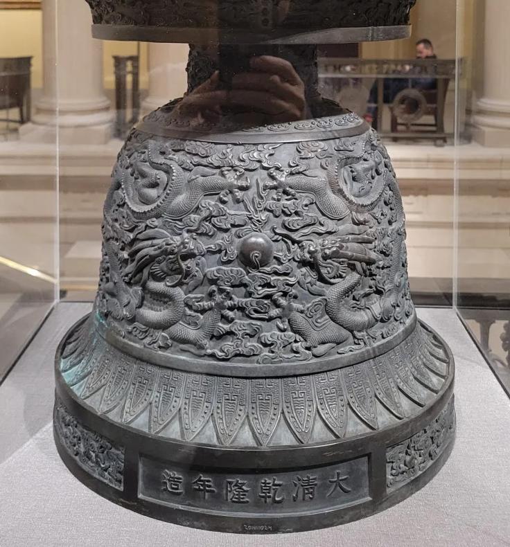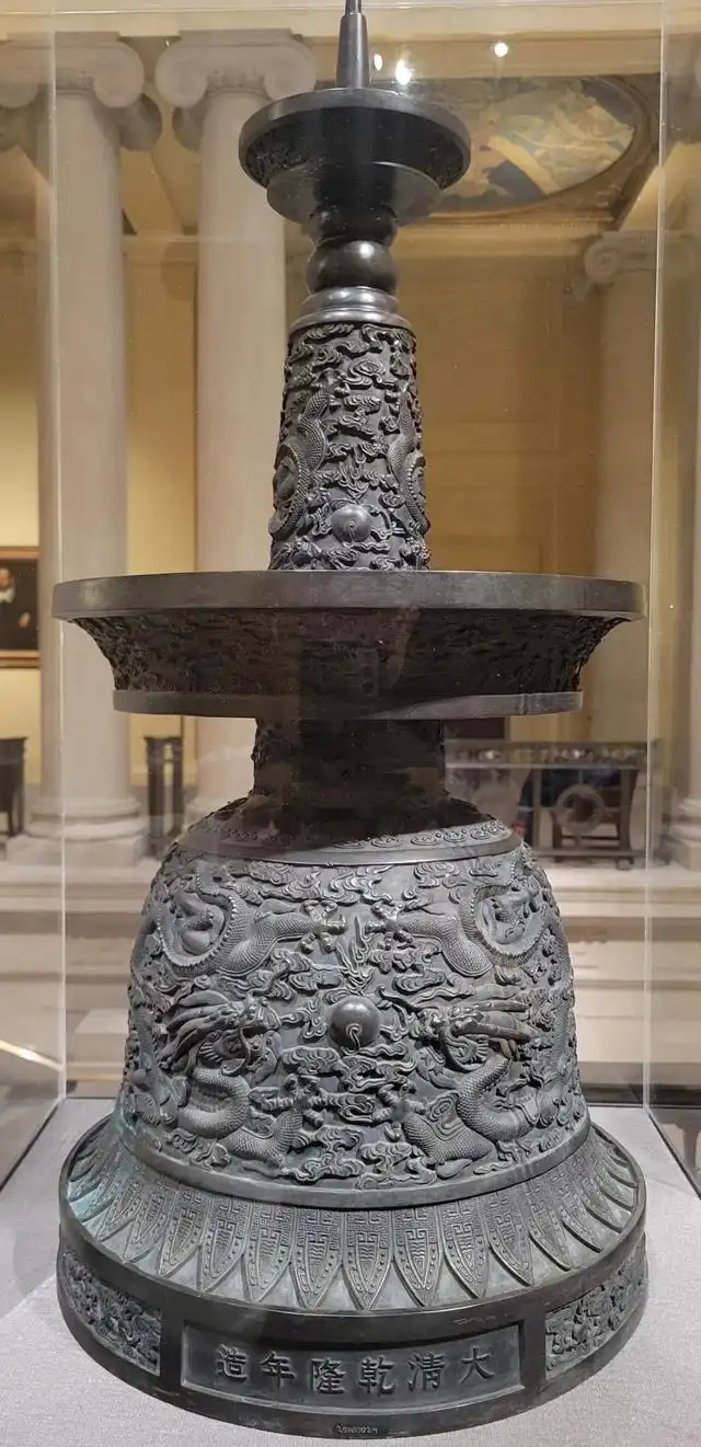 装饰细节:烛台表面以双龙赶珠纹作为主要装饰图案,龙纹雕刻极为精细,龙身蜿蜒矫健,鳞片、爪子等细节清晰可见,生动地展现出龙的威严与动感。龙围绕着宝珠翻腾,周围还饰有云纹、火焰纹等,营造出祥瑞而庄重的氛围。在底座边缘和柱身的一些部位,还雕刻有传统的几何纹和如意纹等辅助纹饰,线条流畅,工艺精湛。烛台底部刻有 “大清乾隆年造” 的字样,字体工整,彰显其皇家器物的身份。整个烛台铜质精良,历经岁月,表面呈现出古朴的色泽,更增添了历史的厚重感。