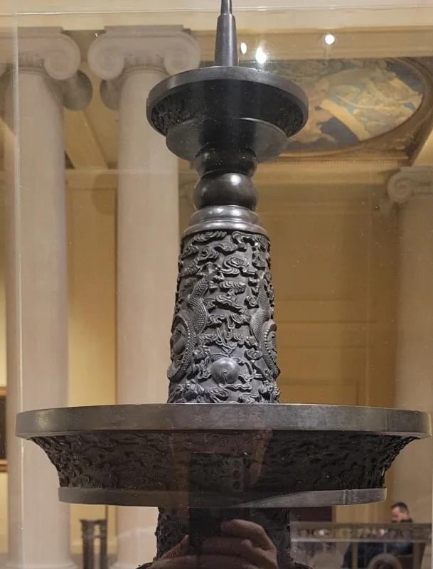 清朝末年至民国年间,中国陷入内忧外患的困境,社会秩序混乱,文物保护意识淡薄。这件铜双龙赶珠纹烛台原可能为宫廷、寺庙或大户人家所有。由于战乱导致经济衰败,原持有者为求生存或其他原因,将其出售。文物贩子或外国收藏者借此机会购得,通过当时管理混乱的文物交易渠道,将其带往美国,最终被波士顿美术馆收藏。