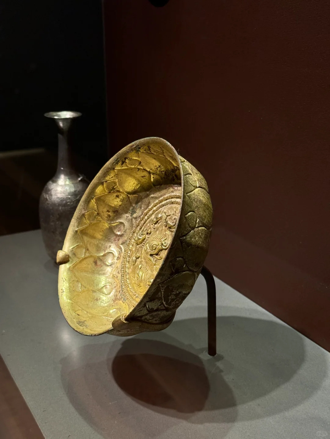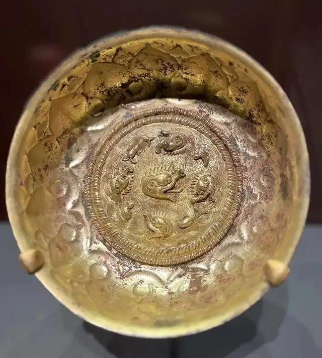 装饰细节:碗身表面采用鎏金工艺,历经岁月,虽部分鎏金有磨损痕迹,但仍散发着华贵的光泽。主体纹饰为摩羯海水纹,摩羯形象刻画得极为生动,龙头鱼身,瞠目张口,造型夸张且富有张力,展现出神秘而威严的气质。海水纹以流畅且富有动感的线条描绘,表现出波涛起伏、汹涌澎湃的景象,与摩羯纹相互呼应,营造出奇幻而壮阔的画面。纹饰雕刻精细,线条清晰,充分体现了唐代工匠精湛的技艺。