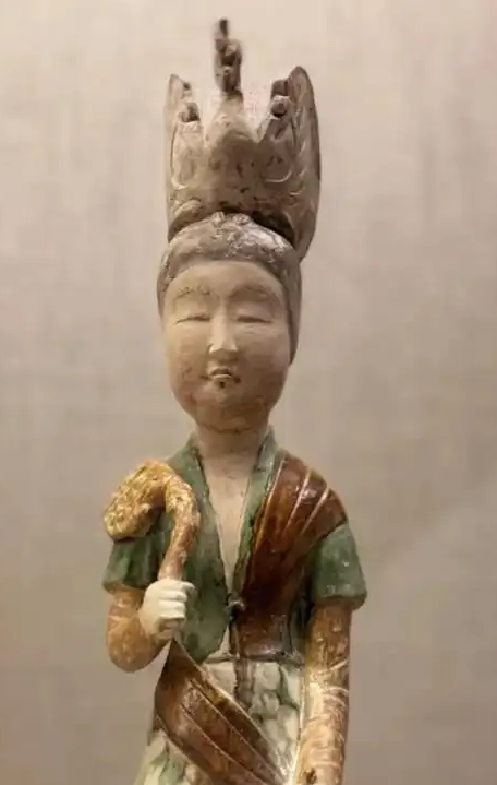 装饰细节:陶俑表面有彩绘痕迹,色彩包括绿色、棕色等,虽历经岁月侵蚀,部分色彩已经脱落或褪色,但仍能看出其色彩搭配和谐,展现了唐代彩绘陶俑的艺术特色。面部表情刻画细腻,五官比例协调,双目微闭,嘴角微微上扬,似带有一丝微笑,给人一种温婉、娴静的感觉。