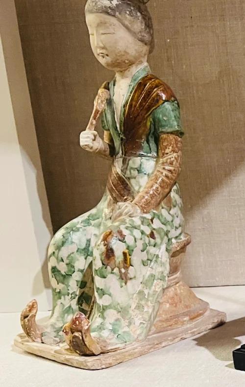 整体造型:宫女呈坐姿,姿态端庄。她头戴凤冠,凤冠造型精美,细节丰富,可能装饰有象征吉祥的凤凰造型及其他珠宝配饰 ,彰显出宫廷女子的身份地位。宫女身穿唐代典型服饰,衣服的纹理和色彩虽因岁月有所剥落,但仍能看出其原本的华丽。她一手持物(可能是某种宫廷用的器具或饰品),另一手自然放置,神态安详。宫女所坐的凳子为沙漏形,这种造型独特,体现了唐代工匠的巧思和当时的家具设计风格。