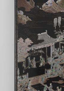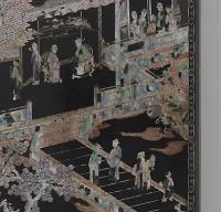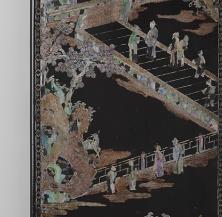 珍珠母贝,金和银镶嵌的漆 尺寸:高3 7/8英寸(9.8厘米); W.9 7/8英寸(25.1厘米); L.28 1/8英寸(71.4厘米) 分类:漆 盒子顶部的接待处暗示了郭子仪将军的生日聚会,盒子侧面有许多男孩,这种印象得到了加强。据说郭子仪有一百个儿子和一千个孙子 。