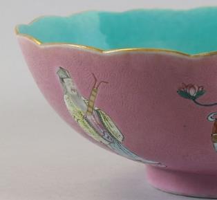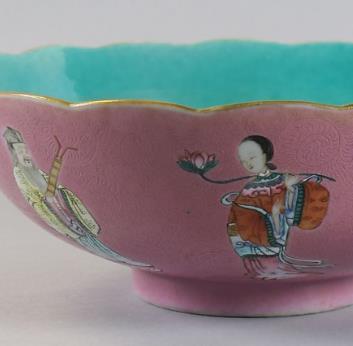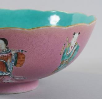 轧道胭脂红地珐琅彩八仙人物碗