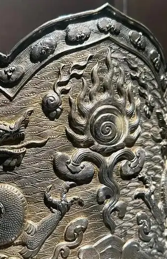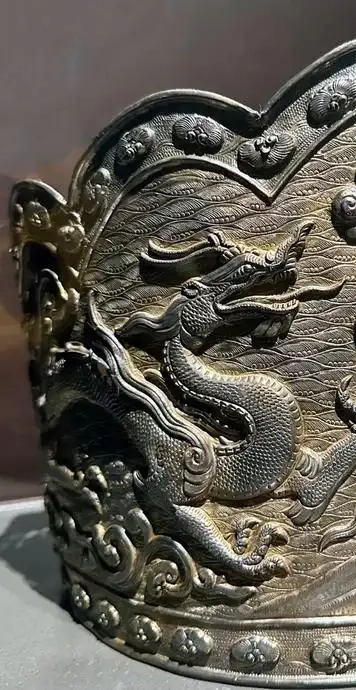 装饰细节:以双龙纹饰为主体装饰,两条龙雕刻得栩栩如生,龙身蜿蜒矫健,鳞片、爪子、须发等细节刻画入微,展现出龙的威严与动感。龙周围还装饰有云纹、火焰纹、海水纹等,营造出神秘而壮阔的氛围,体现了辽代工匠精湛的雕刻技艺和对龙图腾的崇拜。在冠的边缘和其他部位,还点缀有一些小型的装饰图案,如圆形的宝珠纹等,增加了器物的华丽感。银冠表面虽历经岁月,有一定的氧化痕迹,但仍能看出其工艺的精美和材质的优良。