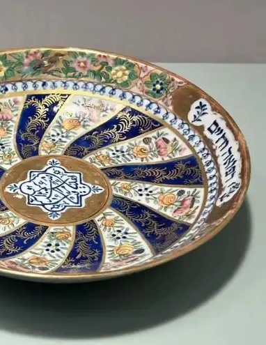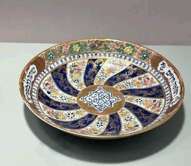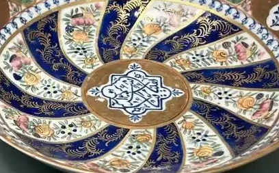 装饰细节:瓷盘表面装饰精美,色彩丰富。以多种颜色绘制图案,如蓝色、金色、粉色、绿色等。盘心位置可能是一个具有异域特色的几何图案,周边环绕着花卉纹,花卉形态逼真,色彩鲜艳,有牡丹、菊花等。盘边缘部分则装饰有文字或几何纹带,可能是阿拉伯文或其他外文,文字书写工整。纹饰布局对称且富有层次感,采用了彩绘和描金等工艺,展现出华丽富贵的视觉效果,体现了明代工匠高超的绘画技艺和装饰水平。此外,瓷盘的釉面光洁温润,质地细腻。