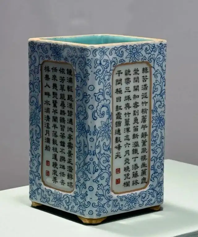 整体造型:笔筒呈四方形,直口直壁,底部有四个小巧的足支撑,造型规整端庄,线条简洁流畅,给人一种稳重、典雅的感觉。