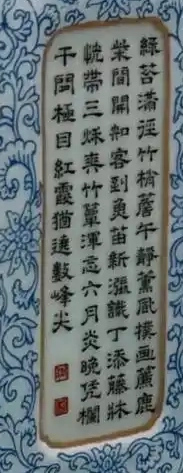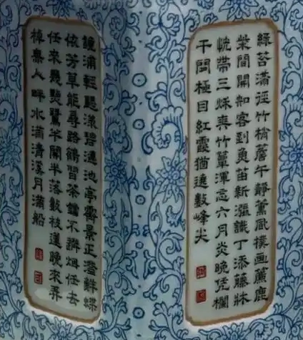 装饰细节:以白色瓷胎为底,运用青花瓷工艺绘制纹饰。笔筒的四面均有装饰,主体部分书写御制诗,字体工整,笔画遒劲有力,展现出较高的书法水平。诗的内容或描绘自然景色,或抒发个人情怀等。诗句周围环绕着精美的青花缠枝花卉纹,花卉形态优美,枝叶缠绕,线条流畅自然,青花发色浓淡相宜,蓝白对比鲜明,既衬托出诗句的庄重,又增添了器物的美感。在笔筒的边缘部位,还可能装饰有回纹、如意纹等辅助纹饰,使整体装饰更加丰富和谐。