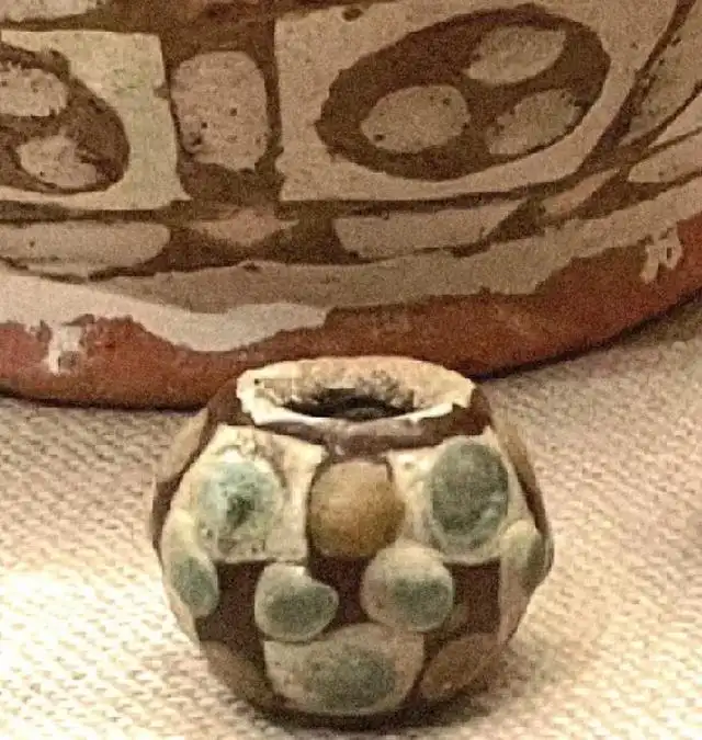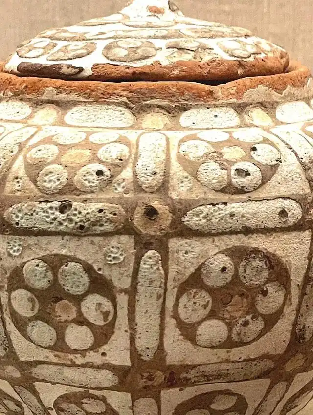 尺寸规格:陶嵌琉璃方格乳钉纹盖罐从图片比例推测,高度可能在 15 - 30 厘米左右,口径可能在 10 - 20 厘米左右;蜻蜓眼琉璃珠直径可能在 1 - 3 厘米左右,但具体尺寸暂未公开。