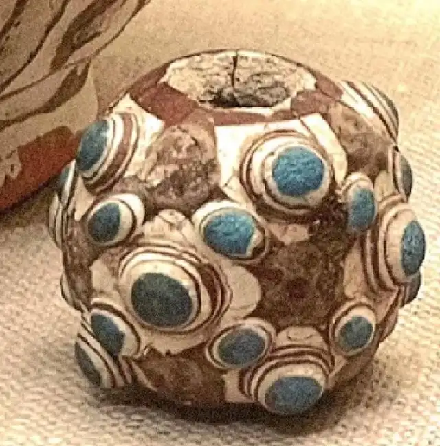 战国蜻蜓眼琉璃珠:图中有两颗,琉璃珠呈球形,表面镶嵌有类似蜻蜓复眼的彩色圆点图案,色彩丰富,有蓝色、绿色、白色等,这些彩色圆点错落分布,如同蜻蜓的眼睛般生动。琉璃珠质地晶莹,虽有一定的磨损和岁月痕迹,但仍能看出其制作工艺的精美和独特。