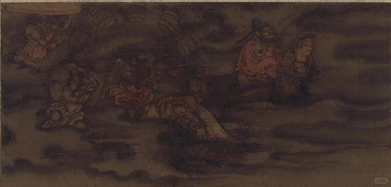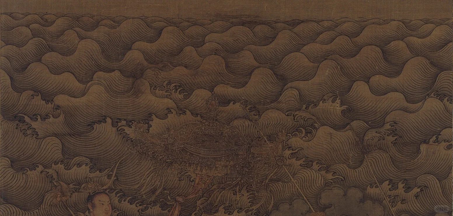 细节描绘:在海水的描绘上,画家运用细腻的笔触,表现出波涛的起伏、涌动,线条富有节奏感,给人以强烈的视觉冲击。天空中的云雾则以淡墨渲染,营造出朦胧缥缈的感觉。画中人物的面部表情、服饰花纹等细节也刻画得较为精细,体现了北宋时期较高的绘画水平。
