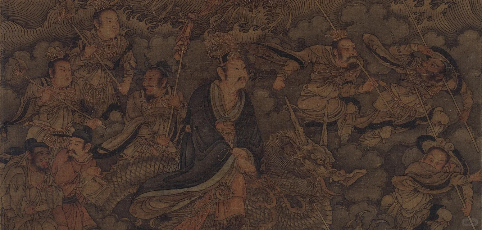 整体构图:画面以水官为中心展开,上方和下方分别营造出不同的场景氛围。上方似乎是云雾缭绕的天界,有一些神仙或神兽形象,增添了神秘氛围;下方则着重描绘波涛汹涌的海水,水官及侍从位于海水之上的云雾间。整体构图饱满,层次分明,通过不同场景的描绘,展现出一种宏大而神秘的意境。