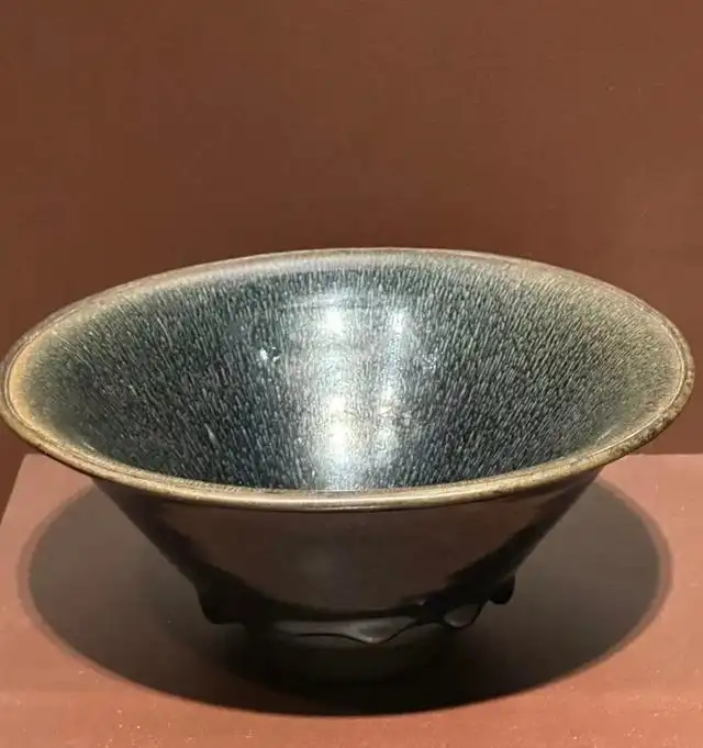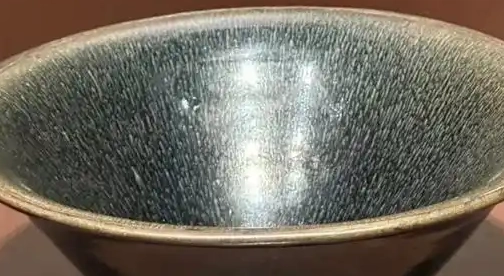 整体造型:兔毫盏为敞口,斜直壁,小圈足,整体造型简洁大方。口沿较薄,微微外撇,便于茶汤的饮用和观赏;腹部斜收,线条流畅,至底部形成较小的圈足,使盏身显得稳定且优雅。
