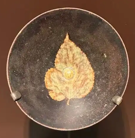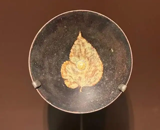 装饰细节:施酱釉,釉色深沉古朴,多呈现出棕褐色调,釉面具有一定的光泽度,且带有自然的开片纹理,增添了古朴的韵味。最具特色的是盏内的叶形纹,这是通过吉州窑独特的木叶贴花工艺制成。一片完整的树叶经过特殊处理后,贴于盏内,在高温烧制过程中,树叶的有机物质被烧掉,留下清晰的叶脉痕迹,呈现出自然而独特的装饰效果。树叶的形态栩栩如生,叶脉纹理清晰可见,与酱釉底色相互映衬,营造出一种自然、雅致的美感。胎体呈灰白色,质地较为细腻,圈足处通常会露出未施釉的胎体,展现出吉州窑瓷器的工艺特点。