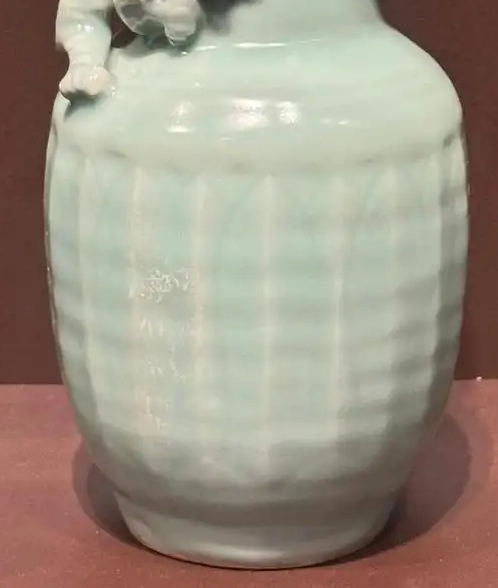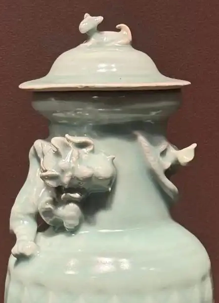 装饰细节:瓶身施粉青或梅子青釉,釉色温润如玉,色泽淡雅,呈现出柔和的青绿色,釉面光洁,有较强的玻璃质感和开片纹理。瓶身一侧塑有龙形装饰,龙身蜿蜒,龙首高昂,龙须、鳞片等细节刻画细致,展现出龙的威严与灵动;另一侧塑有虎形装饰 ,老虎造型逼真,虎目圆睁,虎口大张,尽显凶猛之态。龙虎造型栩栩如生,与温润的釉色形成鲜明对比,增添了器物的艺术感染力。盖钮的小兽造型小巧精致,与瓶身的龙虎装饰相呼应。