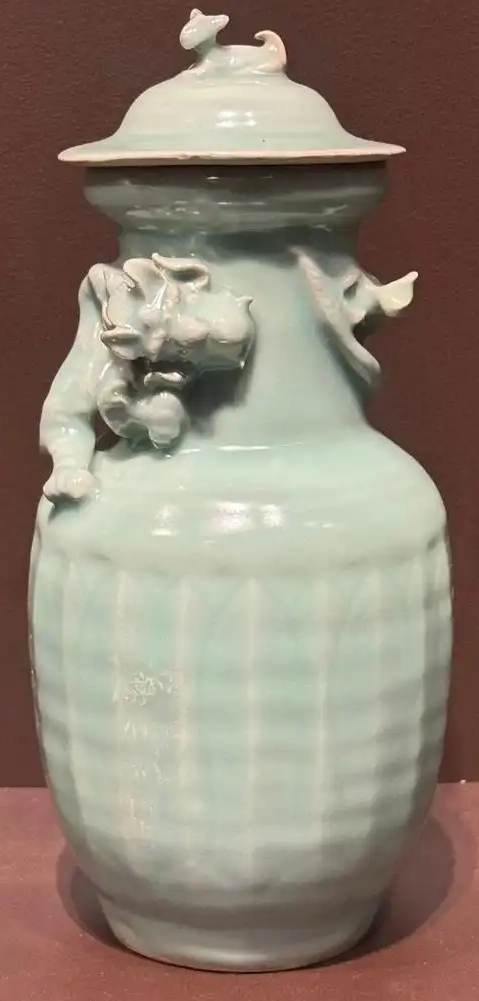 南宋时期,龙泉窑进入鼎盛阶段,成为中国南方著名的瓷窑。当时,社会相对稳定,经济发展,制瓷工艺不断创新,龙泉窑以烧制青瓷著称。龙虎盖瓶在南宋多作为随葬品使用,龙和虎在中国传统文化中是具有特殊象征意义的神兽,龙象征着权威、吉祥,虎象征着驱邪避凶, 这类器物的使用反映了当时人们的宗教信仰和丧葬观念,期望逝者在另一个世界得到守护和安宁。同时,也体现了南宋龙泉窑工匠们精湛的制瓷技艺和丰富的艺术创造力,其产品不仅满足国内需求,还大量出口,在中外文化交流中发挥了重要作用。