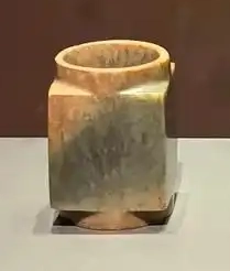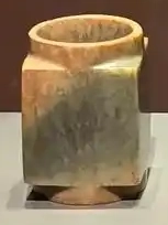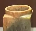 装饰细节:玉琮表面的色泽呈现出多种色调,可能是由于玉石材质本身的矿质成分以及长期埋藏受沁所致,有浅褐色、青绿色等色彩交织。虽然从图片上看装饰相对简洁,但可能在局部存在一些打磨的痕迹或隐约的刻纹,这些刻纹或许与当时的图腾崇拜、祭祀仪式相关 ,不过由于岁月侵蚀和磨损,部分纹饰已不太清晰。玉琮的质地较为细腻,有一定的光泽度,显示出当时玉器加工对选材和打磨工艺的重视。