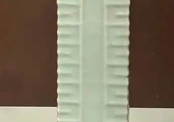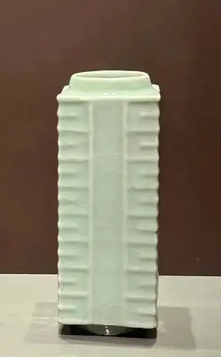 装饰细节:通体施青釉,釉色温润如玉,呈现出淡雅柔和的青绿色,近似于龙泉窑典型的梅子青或粉青色调。釉面光洁莹润,具有较强的玻璃质感,且有自然开片现象,开片纹路或粗或细,纵横交错,增添了器物的古朴韵味。瓶身外部有凹凸相间的横条纹装饰,模仿玉琮的弦纹,这些条纹规整有序,增加了瓶身的层次感和立体感。胎体厚重,质地细腻,圈足处露胎,呈现出灰白色或浅褐色。