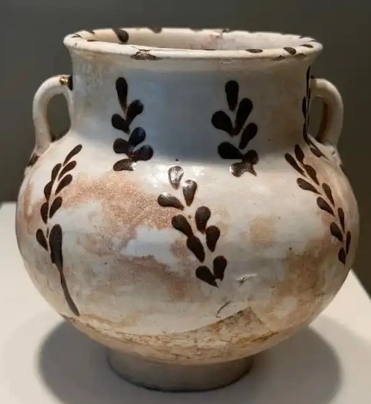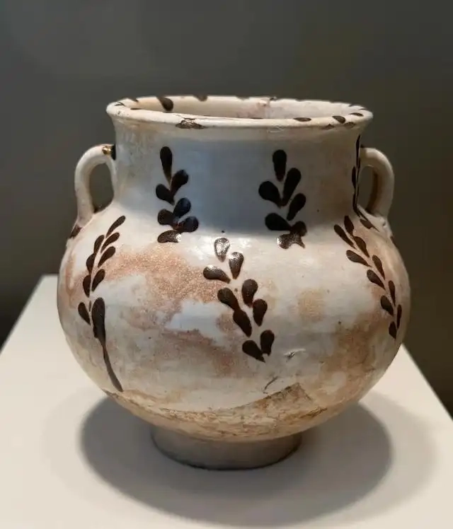 装饰细节:罐体施白釉,釉色白中泛黄,呈现出古朴的质感,釉面有一定程度的磨损和剥落痕迹,显示出岁月的沧桑。罐身上以黑色或深褐色绘制叶纹图案,这些叶纹线条简洁流畅,形态生动,或单独分布,或成组排列 ,增添了器物的装饰性和艺术感。环形耳与罐体衔接自然,耳的表面也施有白釉,与罐体色调一致。圈足处露胎,胎体呈灰白色,质地较为细腻。