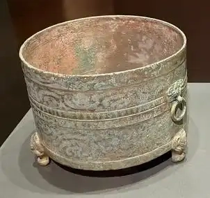 装饰细节:铜尊表面锈迹斑驳,呈现出岁月侵蚀后的古旧色泽,有绿色、褐色等锈斑交织。器身上装饰有多道凸起的弦纹,将器身划分为不同的装饰区域,弦纹规整且富有节奏感。在弦纹之间,雕刻有精美的纹饰,可能是云雷纹、蟠螭纹等传统的青铜器纹饰,这些纹饰线条细腻流畅,图案布局严谨,展现出西汉时期高超的青铜雕刻工艺。环形耳上可能也有简单的装饰,兽形足雕刻生动,形态逼真,增加了器物的艺术感染力。