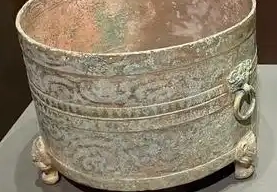 整体造型:铜尊呈圆形,敞口,直腹,底部有三个兽形足支撑,造型规整大气。腹部两侧装有环形耳,方便搬运。整体线条简洁流畅,给人一种稳重、端庄的感觉。