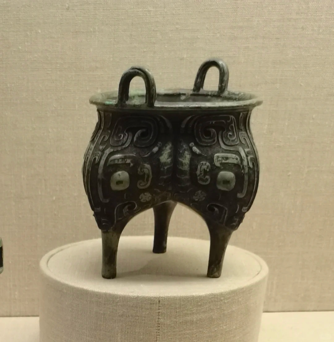 整体造型:该礼器为青铜鬲的形制,侈口,口沿较宽,有一对对称的环形立耳。束颈,腹部丰满且向外鼓出,分裆,下接三个柱状足,整体造型稳重端庄,具有典型的西周青铜鬲的风格特点。