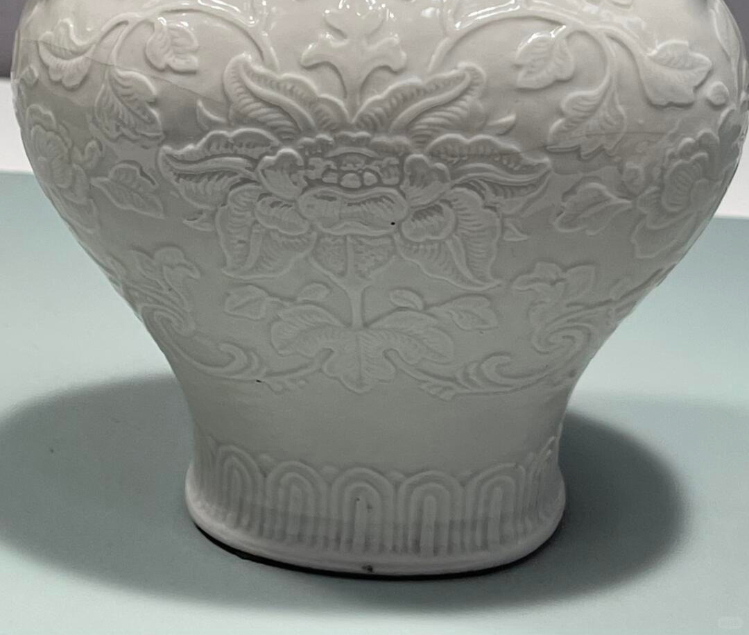 装饰细节:通体施白釉,釉色匀净,呈现出柔和的白色,釉面光洁莹润,有较强的玻璃质感。瓶身以刻花工艺装饰,腹部主体位置刻有大型的花卉图案,可能是牡丹等寓意富贵的花卉,花卉枝叶舒展,形态逼真,周围辅以卷草纹等纹饰,刻纹线条流畅、深浅适中,凸显出纹饰的立体感。颈部和底部也刻有不同的几何纹或卷草纹,与腹部纹饰相呼应,整体装饰布局合理,繁而不乱。圈足处的胎体较为细腻,露胎部分呈现出淡淡的火石红色。