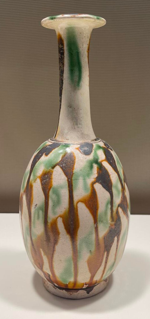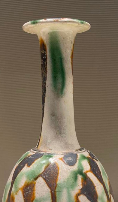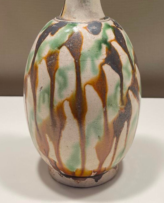 装饰细节:瓶身施三彩釉,主要有绿、棕褐、白等色彩。釉色交融流淌,形成自然而独特的斑纹,如同窑变一般,色彩斑斓且富有动感。颈部釉色相对单一,而腹部色彩变化丰富,不同颜色的釉料相互浸润,产生独特的视觉效果。瓶口边缘和瓶底圈足处釉色较薄,露出胎体,胎体呈现出浅灰色或白色,质地较为细腻但有一定的气孔,这是唐三彩陶器的典型特征。器物表面有岁月留下的磨损痕迹和细微的裂纹,增添了古朴的韵味。