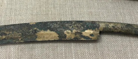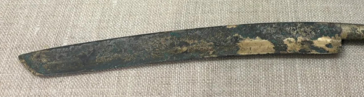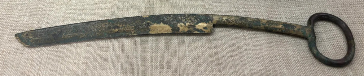 整体造型:铜削整体呈长条形,刀身较窄且略微弯曲,一端为锋利的刃口,用于削刮;另一端为环形手柄,方便握持,整体造型符合当时实用工具的特征。