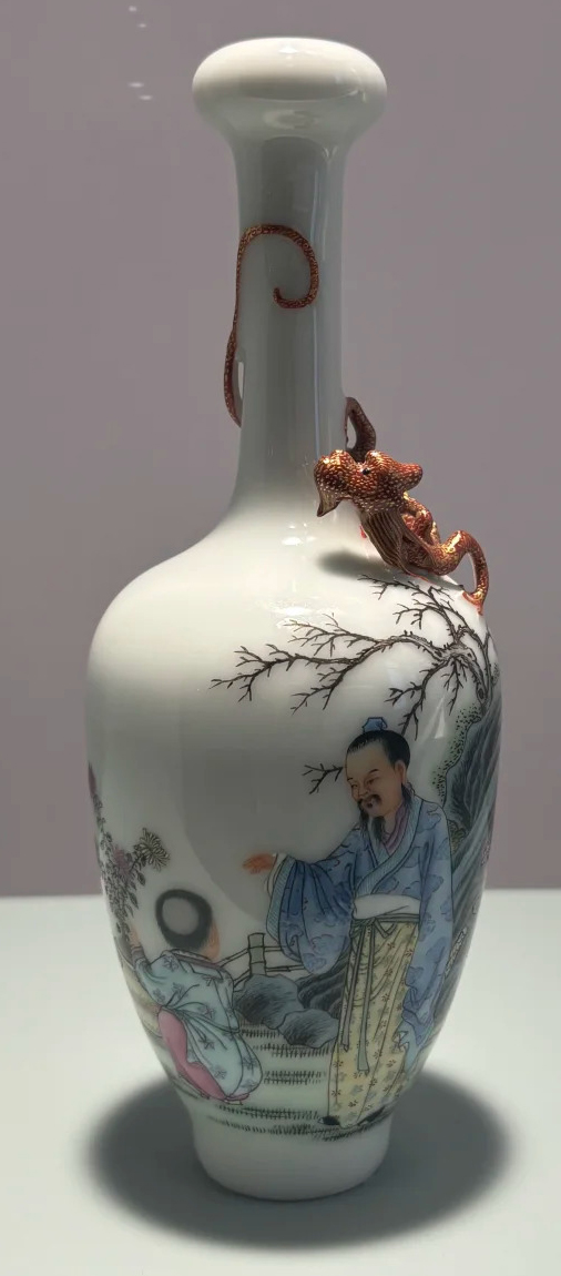 装饰细节:瓶身施白釉,釉面光洁莹润,质感细腻。瓶身绘有精美的粉彩人物图案,描绘了一位身着长袍的文人与童子的场景。文人神态悠然,童子姿态天真,周围点缀有树枝、石头等自然元素,构图疏密得当,富有生活气息。色彩运用丰富,以粉、蓝、绿等色调为主,色彩柔和淡雅,过渡自然,展现了民国时期粉彩瓷的工艺水平。瓶颈处有一只造型生动的红色螭龙装饰,螭龙蜿蜒盘旋,细节丰富,增添了器物的灵动性和艺术美感。
