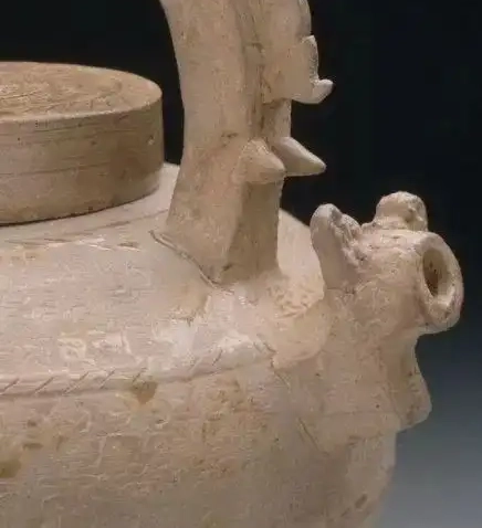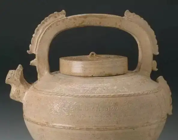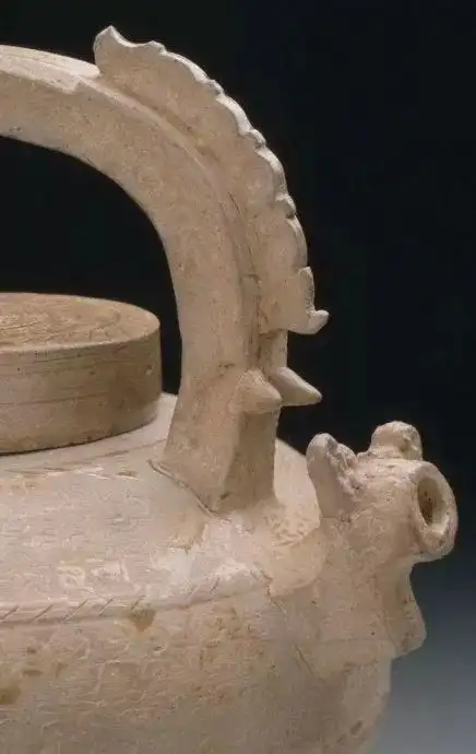 装饰细节:器身表面施有一层薄薄的青釉,釉色泛黄,有明显的开片现象,这是原始青瓷的典型特征。器身上还刻划有简单的纹饰,如弦纹、几何纹等,纹饰线条简洁流畅,虽然不如后来的瓷器纹饰复杂,但具有古朴的美感。提梁造型独特,表面可能装饰有类似龙或其他动物形态的雕刻,增加了器物的艺术感;兽首形流刻画细致,兽嘴张开作为流口,形态生动。
