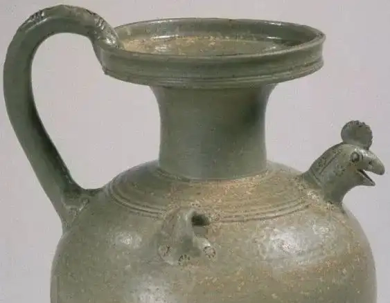 装饰细节:壶身施青釉,釉色泛黄绿色,釉面有细小开片,且分布不均匀,呈现出自然古朴的质感,部分区域因烧制原因,釉色有深浅变化。鸡头雕刻细致,鸡冠高耸,眼睛圆睁,喙部微张,栩栩如生,增加了器物的生动性和趣味性。颈部有几道弦纹装饰,简洁大方,起到了美化和装饰的作用,同时也在一定程度上打破了单调感。把手呈弧形,与壶身衔接自然,表面有简单的压印纹路,增加了把手的立体感和握持时的舒适感。