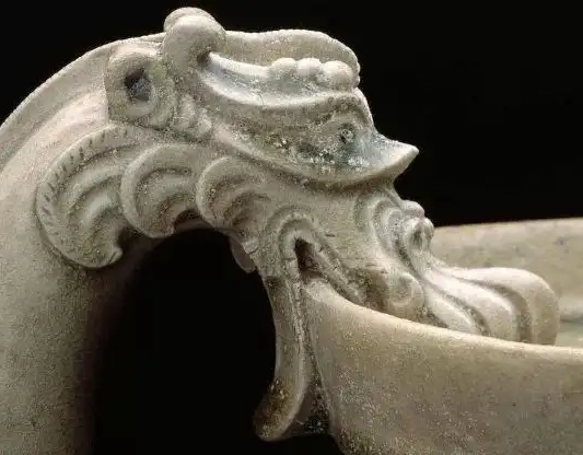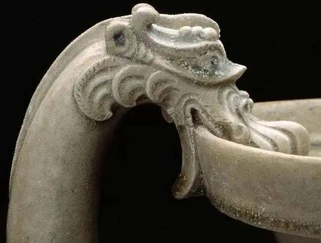 整体造型:壶为盘口,长颈,溜肩,圆腹,平底。壶身一侧设有造型独特的龙形柄,龙首探入壶口,仿佛在饮水,龙身弯曲成柄状,富有动感;另一侧塑有鸡头形流口,鸡头造型写实,鸡冠高耸,眼睛圆睁,喙部微张 。整体造型修长且富有变化,相较于西晋时期的鸡头壶,更显精致和灵动。