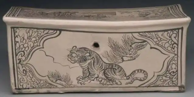 磁州窑以其独特的白地黑绘装饰技法著称,这种技法不仅成本相对较低,适合民间大量生产,而且通过简洁明快的绘画,展现出浓郁的生活气息和民间艺术风格。虎在中国传统文化中是力量、威严和吉祥的象征,常被用于装饰以辟邪驱凶。金代磁州窑瓷枕上的虎纹以及各种人物、动物、山水图案,反映了当时民间的审美观念、宗教信仰和生活习俗。同时,金朝统治区域内民族融合不断加深,多元文化相互影响,也在一定程度上体现在磁州窑瓷器丰富多样的装饰题材和艺术风格中。