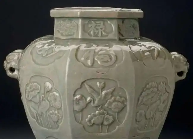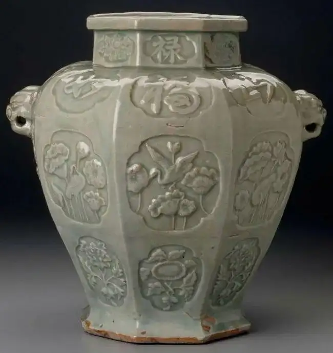 元龙泉六棱浮雕开光兽头罐