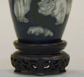 尺寸:H.2 1/2英寸(6.4厘米)多以瓷为胎,也有部分采用玻璃等材质,运用墨彩装饰工艺,在壶体上绘制人物图案。注重在有限的空间内营造出丰富的意境和层次感。画师们巧妙地安排人物的位置和动作,以及周围的景物搭配,使画面疏密得当、错落有致。例如一些墨彩开光山水人物图鼻烟壶,以山水为背景,人物在其间活动,仿佛一幅微型的中国画。