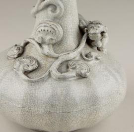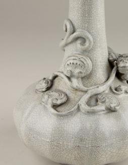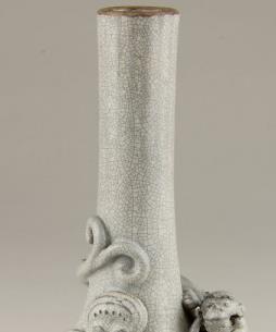 长且挺拔,是瓶身的主要装饰部位之一,通常会在颈部两侧堆塑螭龙耳,螭龙造型生动,身体蜿蜒,仿佛在瓶身上攀爬,增加了器物的施哥窑釉,釉色以灰青为主,也有米黄、粉青等色调,釉面呈现出 “酥油” 般的光泽,属于无光釉,质感温润古朴。釉层凝厚,最厚处甚至与胎的厚度相等,釉面布满自然开片,开片纹有 “金丝铁线” 的特征,即较粗疏的黑色裂纹交织着细密的红、黄色裂纹,如同冰裂般纵横交错,为器物增添了独特的韵味。立体感和动感明代哥釉瓷器的胎色有黑、深灰、浅灰及土黄多种。胎质坚硬细密,质地优良,做工精细,体现了当时较高的制瓷工艺水平。底足未挂釉处通常呈现铁黑色,即 “铁足” 特征。