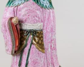 粉彩创烧于康熙晚期,至雍正朝趋于成熟。其 “玻璃白” 晕染技法能细腻表现肌肤、衣料的质感,恰好满足了塑造女性柔美感的需求 —— 相比五彩的浓艳平涂、青花的单一色调,粉彩的粉润色彩更适合刻画仕女的娇羞与温婉。雍正时期,御窑厂汇聚顶尖工匠,将绘画中的 “没骨法”(不用线条勾勒,直接以色彩晕染)融入粉彩,使仕女像的面部、服饰过渡自然,立体感极强,推动了仕女题材雕塑的流行。