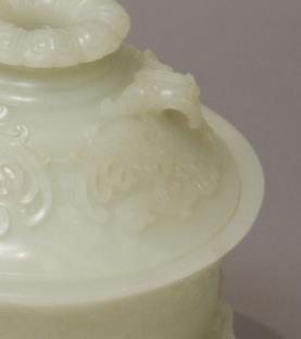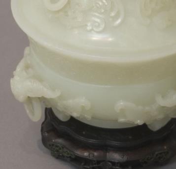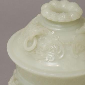 通常选用和田青玉为原料,玉质温润细腻,色泽均匀,呈淡绿色或青灰色,具有较高的透明度和光泽度。盖碗一般由碗身、碗盖和碗托三部分组成。碗身可能为撇口,弧壁,深腹,圈足,造型规整端庄,线条流畅优美。碗盖可能为穹顶形,盖钮造型多样,如桥形钮、宝珠钮等。若有铺首装饰,可能位于碗身两侧,铺首通常为兽首形象,双目圆睁,口衔圆环,雕刻细腻,立体感强,增添了器物的威严感和神秘感。