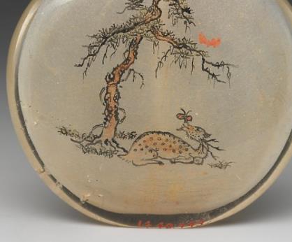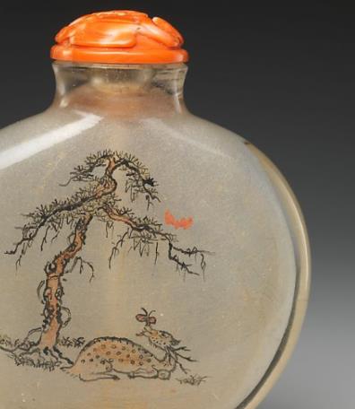 清代,鼻烟壶不仅是盛装鼻烟的实用容器,还是供人们赏玩和显示身份地位的艺术佳品。水晶内画诗文松鹿纹鼻烟壶将水晶的珍贵材质、内画的精湛技艺与传统的诗画文化相结合,深受当时文人雅士、贵族阶层的喜爱,成为他们把玩、收藏和相互馈赠的物品。