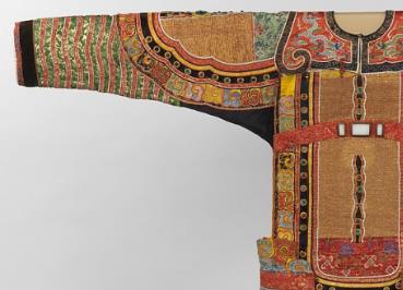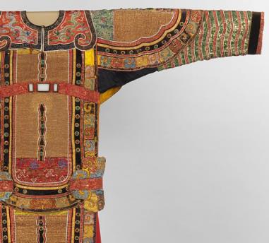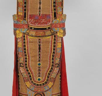 康熙时期的武将戏服大多以各类丝织品为地,如江宁织造的云锦、苏州织造的纡丝和刺绣织物等,再加以刺绣、钉缀饰件等工艺。戏服上的图案多采用金、银线绣制,色彩浓艳,花纹宏丽,体现了当时高超的工艺水平。