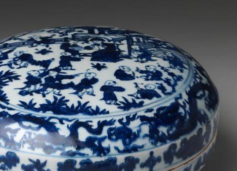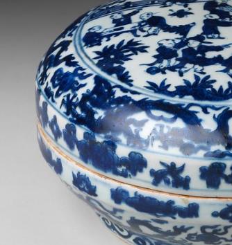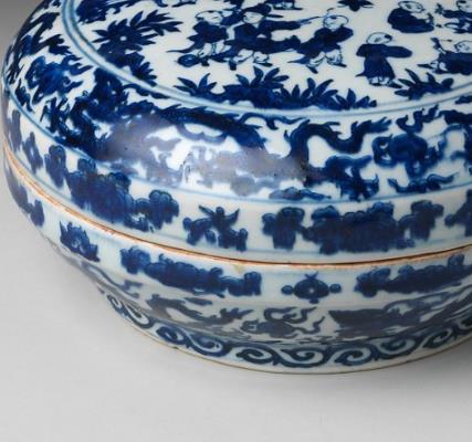 明代社会重视家族繁衍,“多子多福” 是普遍追求,婴戏纹正契合这一观念,成为瓷器上的经典题材。同时,随着商品经济发展,市民阶层壮大,女性对妆具的需求增加,粉盒作为日常用品,既需实用,又需美观,青花婴戏纹因其吉祥寓意与清新风格,深受市场青睐。