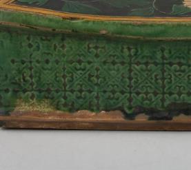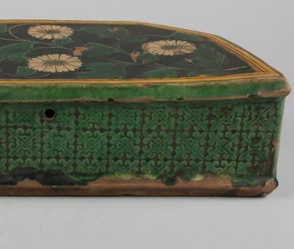 瓷枕多为长方形或如意形,少数为椭圆形。长方形枕通常四角圆润,枕面微弧,两侧稍斜,底部平整,便于放置;如意形枕则边缘模仿如意纹曲线,造型更为灵动。尺寸一般长 20-30 厘米,宽 15-20 厘米,高 8-12 厘米,大小适中,既符合人体侧卧时的舒适需求,又便于携带或陈设。金代虽为少数民族政权,但积极吸收汉文化,陶瓷纹饰中的花卉题材正是中原传统文化的体现,而三彩工艺本身则是多民族技术交流的成果,反映了当时北方地区各民族文化的交融。