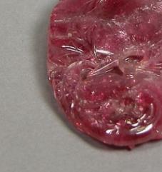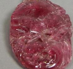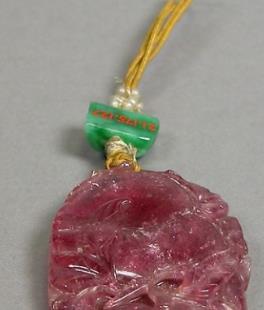 长 4.2 公分,宽 2.38 公分,厚 1.1 公分,全长 9.0 公分。整体略近卵石状,粉红色,外壁浅浮雕桃实枝叶,寓意长寿。碧玺佩一端系黄丝线,上缉白米珠绿玉结子。
