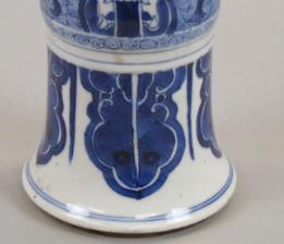 花觚采用三段式设计,上部为喇叭形口,敞口角度较大,近 90°;中部腹部微鼓;下部胫部外撇,呈现出鲜明的层次感。常见有玉璧形圈足、平底等,底部多为双圈款,无书写文字。整体造型古拙,凝重质朴,线条流畅挺拔,体现了康熙时期瓷器造型设计的独特魅力。