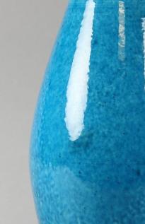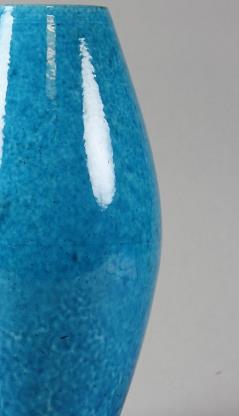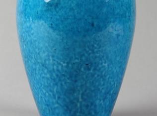 清洒蓝釉橄榄瓶是清代单色釉瓷器中兼具工艺美感与时代风格的典型器物,其以独特的釉色工艺、规整的器型设计,展现了清代制瓷业在单色釉领域的高超水准,同时折射出清代不同时期的审美取向与社会文化背景。口、短颈,颈部微微内收;腹部中段圆润饱满,是器型的视觉重心;下腹至圈足处逐渐内收,线条流畅自然,形成 “上窄 — 中宽 — 下窄” 的对称曲线,既符合中国传统 “中庸和谐” 的审美,又因线条的柔和过渡显得雅致灵动。